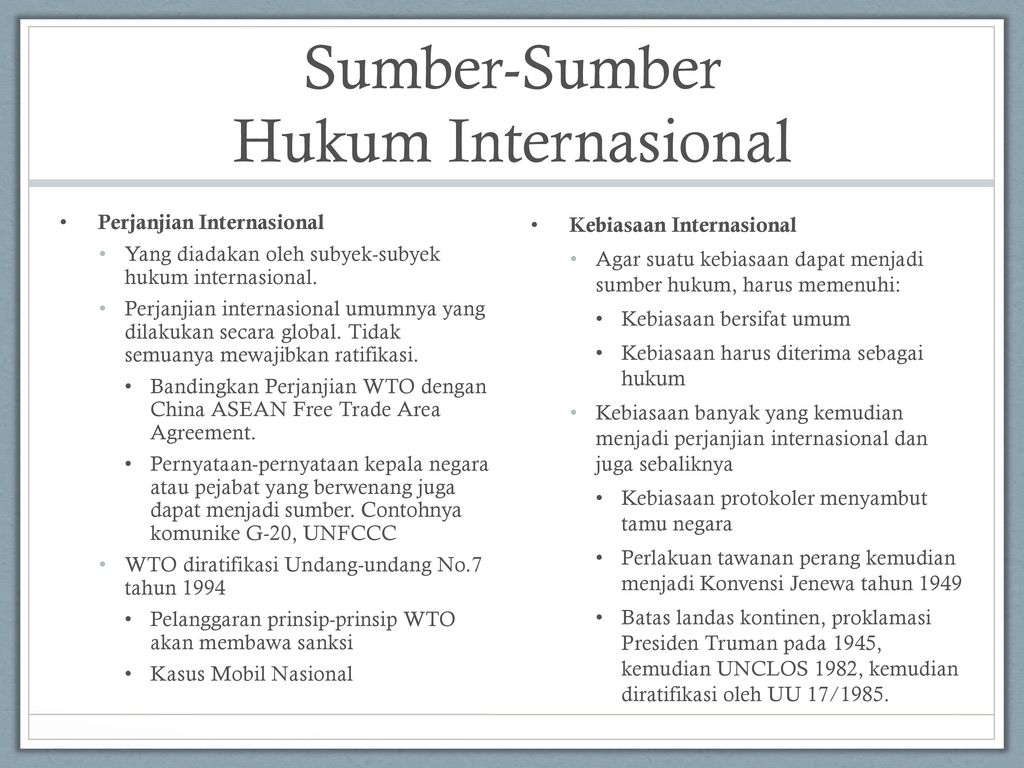 • Kebiasaan memerlukan dua elemen: praktik yang konsisten dan penerimaan sebagai kewajiban hukum.