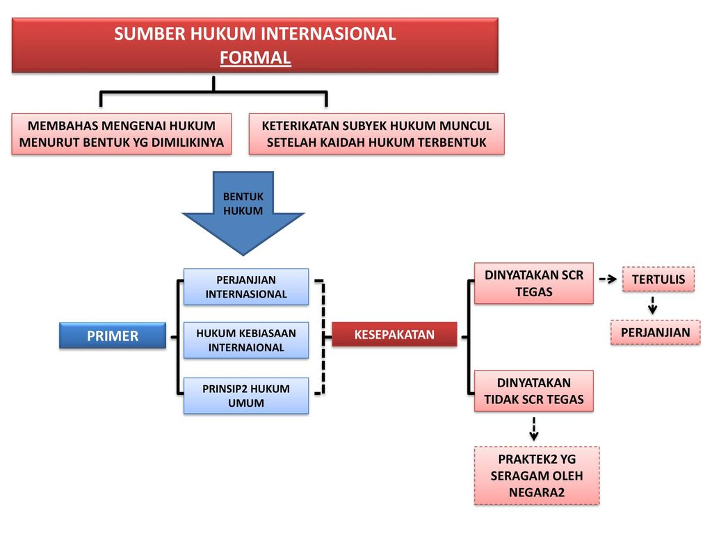 • Hukum jus cogens (norma imperatif, seperti larangan penyiksaan) dan erga omnes (kewajiban terhadap semua) memiliki status khusus.