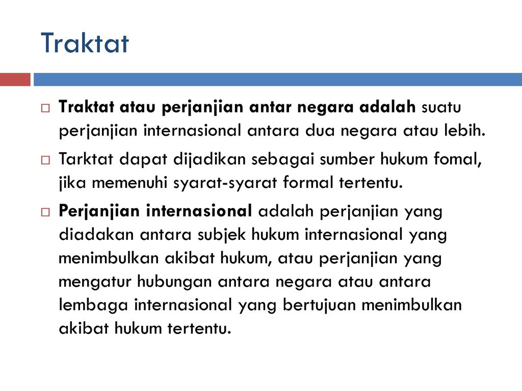 • Prinsip Hukum Umum: Prinsip seperti pacta sunt servanda (perjanjian harus ditaati) menjadi dasar fundamental hukum traktat.
